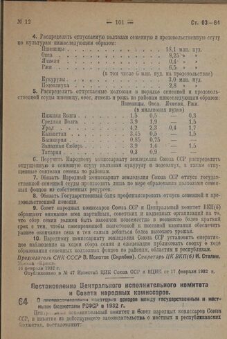 Постановление Центрального Исполнительного Комитета и Совета Народных Комиссаров. О перераспределении некоторых доходов между государственным и местными бюджетами РСФСР в 1932 г. 17 февраля 1932 г. № 29/117