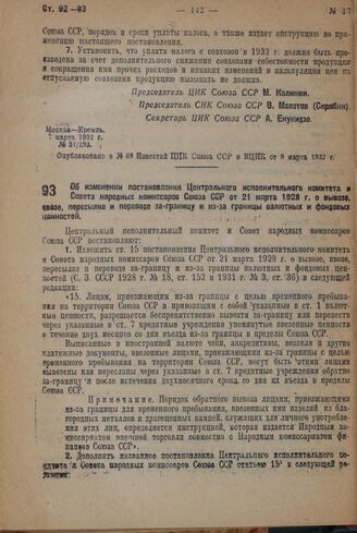 Постановление Центрального Исполнительного Комитета и Совета Народных Комиссаров. Об изменении постановления Центрального исполнительного комитета и Совета народных комиссаров Союза ССР от 21 марта 1928 г. о вывозе, ввозе, пересылке в переводе за-...