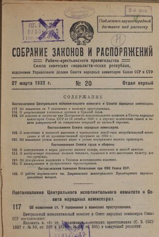 Постановление Центрального Исполнительного Комитета и Совета Народных Комиссаров. Об изменении ст. 7 положения о воинских преступлениях. 17 марта 1932 г. № 82/315