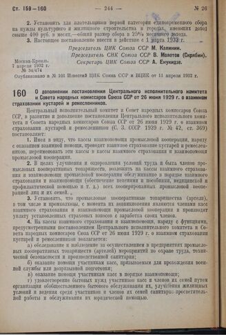 Постановление Центрального Исполнительного Комитета и Совета Народных Комиссаров. О дополнении постановления Центрального исполнительного комитета и Совета народных комиссаров Союза ССР от 26 июня 1929 г. о взаимном страховании кустарей и ремесленников. 7 апреля 1932 г. № 34/468