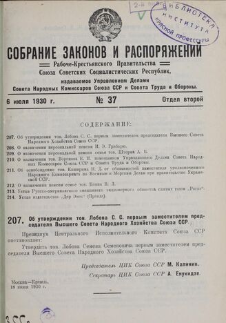 Об утверждении тов. Лобова С.С. первым заместителем председателя Высшего Совета Народного Хозяйства Союза ССР. 18 июня 1930 г.