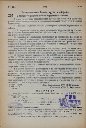 Постановление Совета труда и обороны. О порядке утверждения проектов паросилового хозяйства. 3 мая 1932 г. № 466
