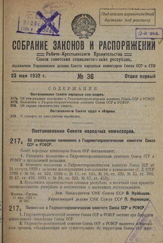 Постановление Совета Народных Комиссаров. Положение о Гидрометеорологическом комитете Союза ССР и РСФСР. 11 мая 1932 г. № 707