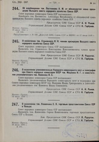 Об освобождении тов. Постникова А.М. от обязанностей члена президиума Высшего совета народного хозяйства Союза ССР. 16 июля 1930 г. № 160 // Распубликовано в № 195 Известий ЦИК Союза ССР и ВЦИК от 17 июля 1930 г.