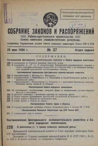 Постановление Центрального Исполнительного Комитета и Совета Народных Комиссаров. О дополнении ст. 3 правил взимания земельной ренты. 17 мая 1932 г. № 37/595