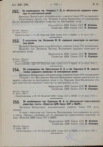 Об утверждении тов. Крестинского Н.Н. и тов. Карахана Л.М. заместителями народного комиссара по иностранным делам. 21 июля 1930 г. // Распубликовано в № 200 Известий ЦИК Союза ССР и ВЦИК от 22 июля 1930 г.