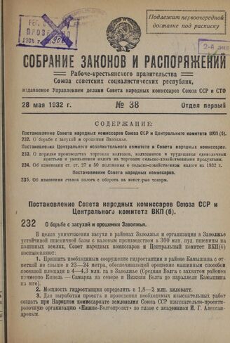 Постановление Совета народных комиссаров Союза ССР и Центрального комитета ВКП(б). О борьбе с засухой и орошении Заволжья. 22 мая 1932 г. // Опубликовано в № 141 Известий ЦИК Союза ССР и ВЦИК от 23 мая 1932 г.