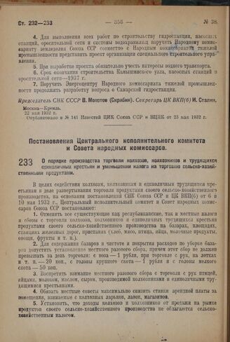 Постановление Центрального Исполнительного Комитета и Совета Народных Комиссаров. О порядке производства торговли колхозов, колхозников и трудящихся единоличных крестьян и уменьшении налога на торговлю сельско-хозяйственными продуктами. 20 мая 1932 г.