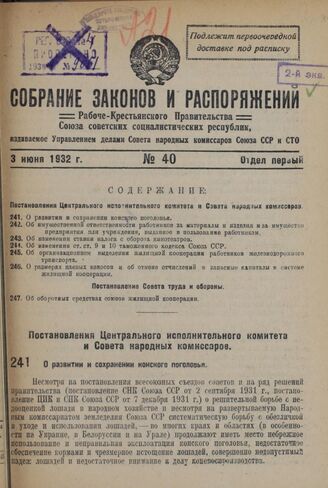 Постановление Центрального Исполнительного Комитета и Совета Народных Комиссаров. О развитии и сохранении конского поголовья. 27 мая 1932 г.