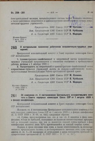 Постановление Центрального Исполнительного Комитета и Совета Народных Комиссаров. О материальном положении работников исправительно-трудовых учреждений. 7 июня 1932 г. № 39/825
