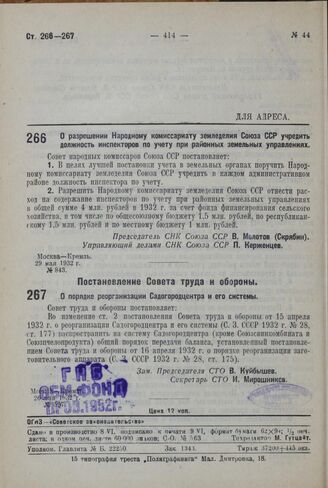 Постановление Совета труда и обороны. О порядке реорганизации Садогородцентра и его системы. 26 мая 1932 г. № 597