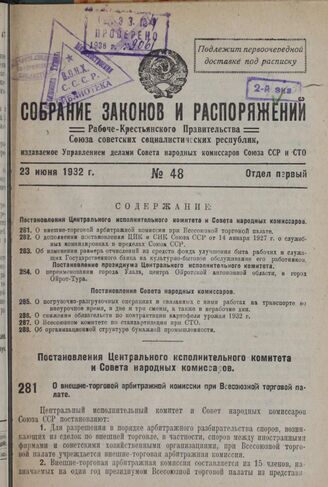 Постановление Центрального Исполнительного Комитета и Совета Народных Комиссаров. О внешне-торговой арбитражной комиссии при Всесоюзной торговой палате. 17 июля 1932 г.
