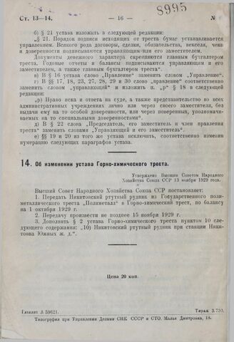 Об изменении устава Горно-химического треста. Утверждено ВСНХ СССР 13 ноября 1929 г.