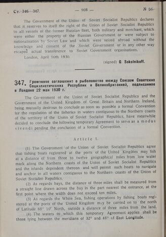 Временное соглашение о рыболовстве между Союзом Советских Социалистических Республик и Великобританией, подписанное в Лондоне 22 мая 1930 г.