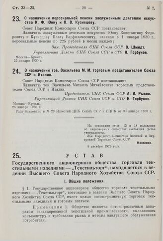 О назначении тов. Васильева М.М. торговым представителем Союза ССР в Италии. 26 января 1930 г. // Распубликовано в № 29 Известий ЦИК Союза ССР и ВЦИК от 30 января 1930 г.