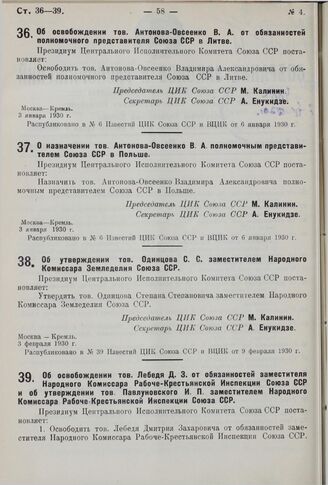 О назначении тов. Антонова-Овсеенко В.А. полномочным представителем Союза ССР в Польше. 3 января 1930 г. // Распубликовано в № 6 Известий ЦИК Союза ССР и ВЦИК от 6 января 1930 г.