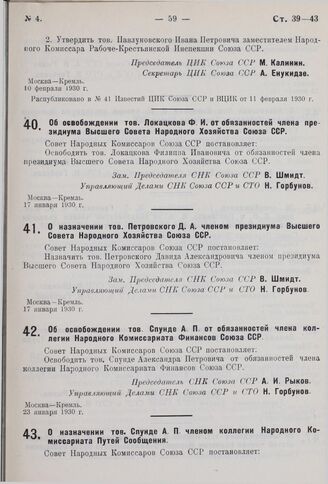 Об освобождении тов. Спунде А.П. от обязанностей члена коллегии Народного Комиссариата Финансов Союза ССР. 23 января 1930 г.