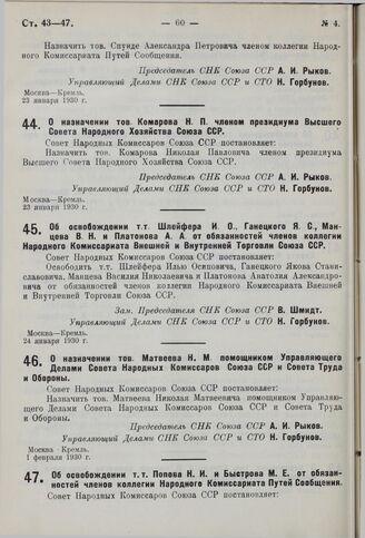 Об освобождении т.т. Шлейфера И.О., Ганецкого Я.С., Майцева В.Н. и Платонова А.А. от обязанностей членов коллегии Народного Комиссариата Внешней и Внутренней Торговли Союза ССР. 24 января 1930 г.