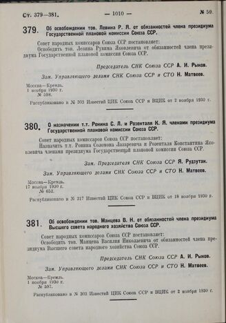 Об освобождении тов. Манцева В.Н. от обязанностей члена президиума Высшего совета народного хозяйства Союза ССР. 1 ноября 1930 г. № 597 // Распубликовано в № 303 Известий ЦИК Союза ССР и ВЦИК от 2 ноября 1930 г.