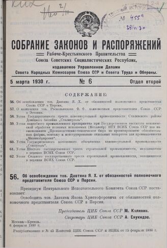 Об освобождении тов. Давтяна Я.X. от обязанностей полномочного представителя Союза ССР в Персии. 6 февраля 1930 г. // Распубликовано в № 45 Известий ЦИК Союза ССР и ВЦИК от 15 февраля 1930 г.