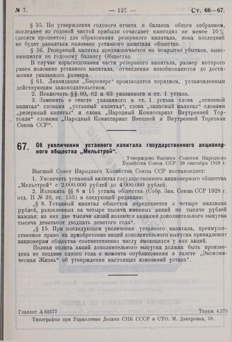 Об увеличении уставного капитала государственного акционерного общества «Мельстрой». Утверждено ВСНХ СССР 28 сентября 1929 г.