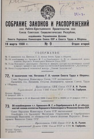 Об освобождении т.т. Вронского М.Г. и Серебровского А.П. от обязанностей членов коллегии Народного Комиссариата Финансов Союза ССР. 21 февраля 1930 г.