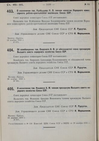 О назначении т. Куйбышева Н.В. членом коллегии Народного комиссариата рабоче-крестьянской инспекции Союза ССР. 26 ноября 1930 г. № 673