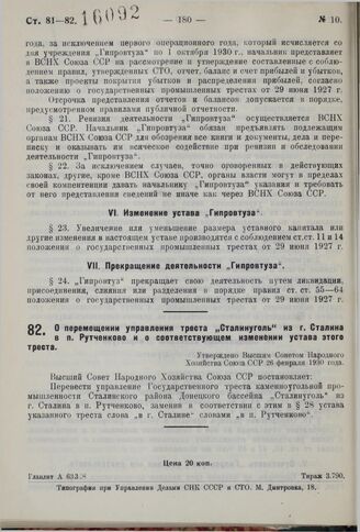 О перемещении управления треста «Сталинуголь» из г. Сталина в п. Рутченково и о соответствующем изменении устава этого треста. Утверждено ВСНХ СССР 26 февраля 1930 г.