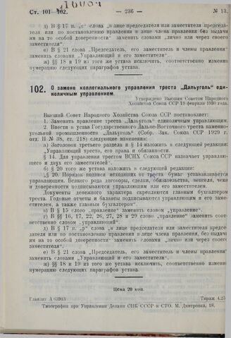 О замене коллегиального управления треста «Дальуголь» единоличным управлением. Утверждено ВСНХ СССР 19 февраля 1930 г.