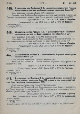 Об освобождении тов. Лебедева П.А. от обязанностей члена Главного концессионного комитета при Совете народных комиссаров Союза ССР. 25 декабря 1930 г. № 790