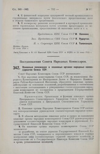 Постановление Совета Народных Комиссаров. Основные положения о плановых органах народных комиссариатов Союза ССР. 14 июня 1928 г.