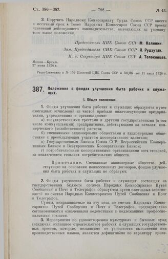 Постановление Центрального Исполнительного Комитета и Совета Народных Комиссаров. Положение о фондах улучшения быта рабочих и служащих. 27 июня 1928 г. // Распубликовано в № 159 Известий ЦИК Союза ССР и ВЦИК от 11 июля 1928 г.