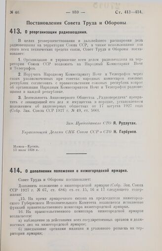 Постановление Совета Труда и Обороны. О реорганизации радиовещания. 13 июля 1928 г.