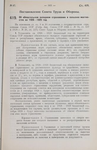 Постановление Совета Труда и Обороны. Об обязательном окладном страховании в сельских местностях на 1928-1929 год. 13 июля 1928 г.