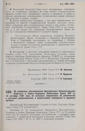 Постановление Центрального Исполнительного Комитета и Совета Народных Комиссаров. Об изменении постановления Центрального Исполнительного Комитета и Совета Народных Комиссаров Союза ССР от 15 октября 1926 года об основных положениях об ученичестве у кустарей, ремесленников, в промысловой кооперации и трудовых артелях. 24 октября 1928 г.