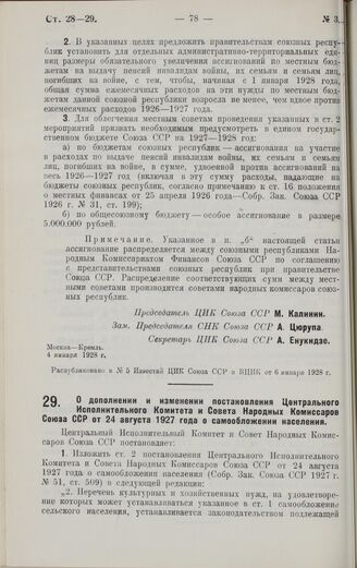 Постановление Центрального Исполнительного Комитета и Совета Народных Комиссаров. О дополнении и изменении постановления ЦИК и СНК Союза ССР от 24 августа 1927 года о самообложении населения. 10 января 1928 г.