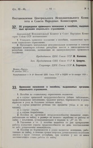 Постановление Центрального Исполнительного Комитета и Совета Народных Комиссаров. Временное положение о пособиях, выдаваемых органами социального страхования. 28 декабря 1927 г.