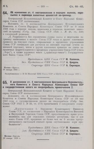 Постановление Центрального Исполнительного Комитета и Совета Народных Комиссаров. Об изменении ст. 4 постановления о порядке вывоза, пересылки и перевода валютных ценностей за-границу. 18 января 1928 г.