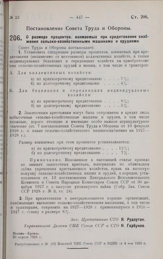 Постановление Совета Труда и Обороны. О размере процентов, взимаемых при кредитовании снабжения сельско-хозяйственными машинами и орудиями. 20 апреля 1928 г.