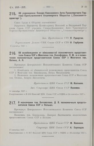 О назначении тов. Богомолова, Д. В. полномочным представителем Союза ССР в Польше. 17 сентября 1927 г. // Распубликовано в № 217 Известий ЦИК Союза ССР и ВЦИК от 22 сентября 1927 г.