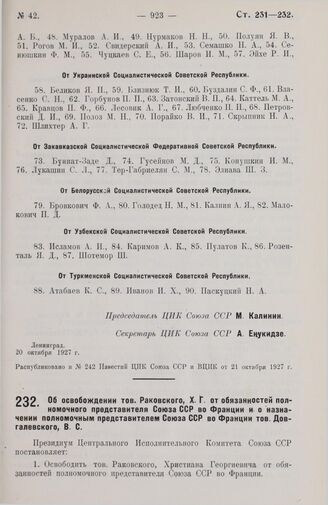 Об освобождении тов. Раковского, X. Г. от обязанностей полномочного представителя Союза ССР во Франции и о назначении полномочным представителем Союза ССР во Франции тов. Довгалевского, В. С. 21 октября 1927 г.