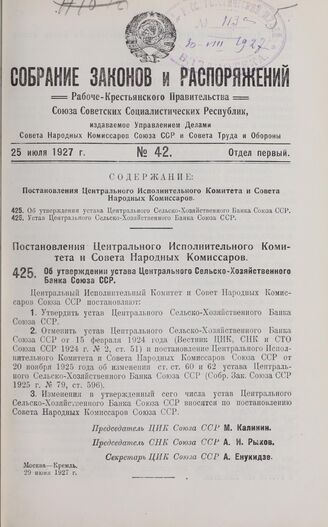 Постановление Центрального Исполнительного Комитета и Совета Народных Комиссаров. Об утверждении устава Центрального Сельско-Хозяйственного Банка Союза ССР. 29 июня 1927 г.