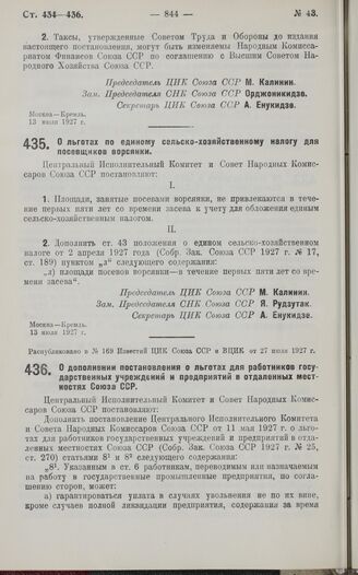 Постановление Центрального Исполнительного Комитета и Совета Народных Комиссаров. О дополнении постановления о льготах для работников государственных учреждений и предприятий в отдаленных местностях Союза ССР. 13 июля 1927 г. // Распубликовано в № 164 Известий ЦИК Союза ССР и ВЦИК от 21 июля 1927 г.