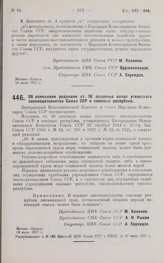 Постановление Центрального Исполнительного Комитета и Совета Народных Комиссаров. Об изменении редакции ст. 38 основных начал уголовного законодательства Союза ССР и союзных республик. 13 июля 1927 г.
