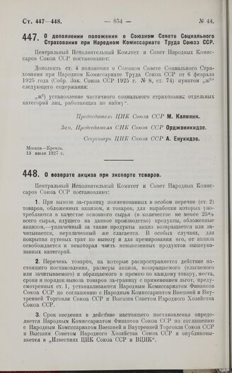 Постановление Центрального Исполнительного Комитета и Совета Народных Комиссаров. О дополнении положения о Союзном Совете Социального Страхования при Народном Комиссариате Труда Союза ССР. 13 июля 1927 г.