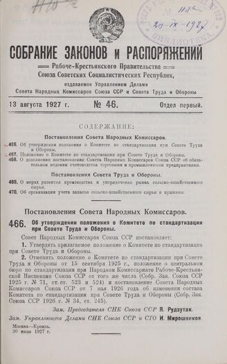 Постановление Совета Народных Комиссаров. Об утверждении положения о Комитете по стандартизации при Совете Труда и Обороны. 30 июля 1927 г.