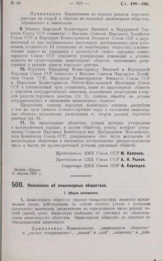 Постановление Центрального Исполнительного Комитета и Совета Народных Комиссаров. Положение об акционерных обществах. 17 августа 1927 г.