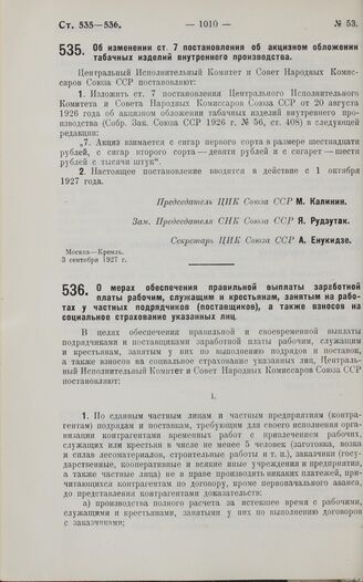 Постановление Центрального Исполнительного Комитета и Совета Народных Комиссаров. Об изменении ст. 7 постановления об акцизном обложении табачных изделий внутреннего производства. 3 сентября 1927 г.