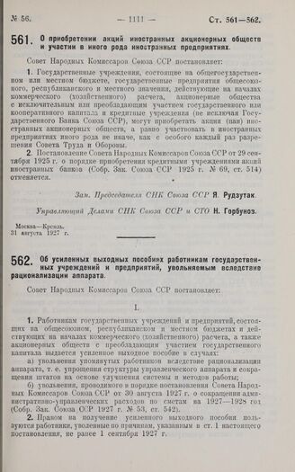 Постановление Совета Народных Комиссаров. Об усиленных выходных пособиях работникам государственных учреждений и предприятий, увольняемым вследствие рационализации аппарата. 27 сентября 1927 г.