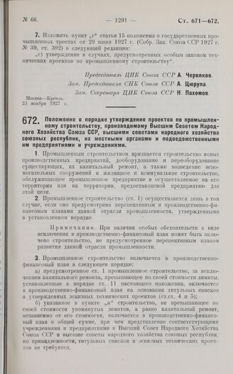 Постановление Центрального Исполнительного Комитета и Совета Народных Комиссаров. Положение о порядке утверждения проектов по промышленному строительству, производимому Высшим Советом Народного Хозяйства Союза ССР, высшими советами народного хозяй...